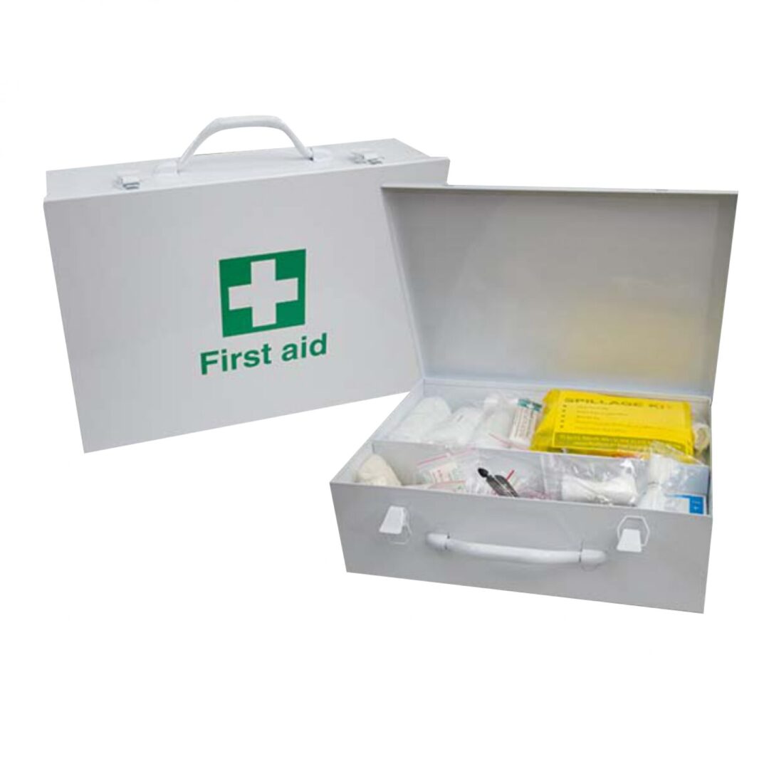 Regulation 7 First Aid Kit In Metal Box comes with all the essentials you need to care for a range of first aid conditions. Our Regulation 7 First Aid Kit comes complete with a range on items that includes wound dressings, bandages, plasters, gauze, surgical gloves, an eye patch, pain tablets, a CPR device, a rescue foil blanket and so much more.
